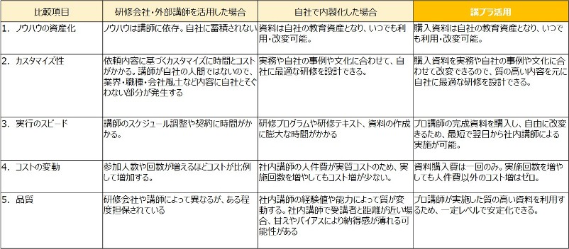 一方で、書式などもたくさん出ている一般的な考え方や手法に関すること、業務実務に関する知識・スキルの研修、コンプライアンス、ハラスメントなど実施頻度の多いものについては内製化を行うメリットがあります。