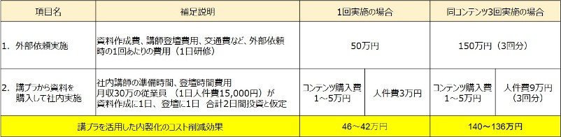 一度コンテンツを作成してしまえば、講師料が不要となり、実施回数を増やしてもコスト増を最小限に抑えられる。