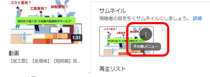 <実施方法> 1.まず、サムネイル項目の画像にカーソルを合わせると現れる「その他メニュー」を クリックします。 ![]() 2.そこで、表示される「テストと比較」をクリックします。 ![]() 3.サムネイルのアップロード画面が立ち上がるので、比較したい3つのサムネイルを アップロードし、完了ボタンを押すと設定完了です。 ![]() 4.テストが開始すると、下記のようにサムネイル欄にアップロードした3枚のサムネイル が表示されます。 ![]() 5.データがたまってきたら、サムネイル項目で再度「その他メニュー」を表示し、クリック。 ![]() 6.「テストレポ―ト表示」をクリックします。 ![]() 7.サムネイル毎の再生時間の割合が表示されるので、比率が一番高いものを選びます。 ![]() |
